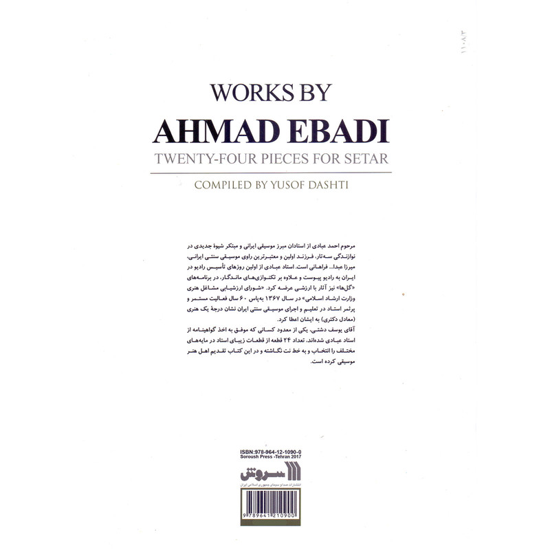 احمد عبادی (1371 - 1285 ) فرزند میرزا عبدالله نوازندۀ چیره دست تار و سه تار و اولین و معتبرترین راوی ردیف موسیقی سنتی ایران است که اگرچه در کودکی (هفت سالگی) پدر را از دست داد، ولی نشان داد که همچون او راهی را برگزیده است که دیگران از پیمودنش عاجزند. آنچه عبادی را از همتایانش ممتاز می سازد ابداعات اوست در شیوۀ نوازندگی سه تار. از ثمرات عمر استاد،قطعات زیبا و دلنشینی است که درمایۀهای مختلف اجرا کرده و 24 قطعه از آن ها را یوسف دشتی، شاگرد استاد عبادی ،در این کتاب به خط نت نگاشته و به مشتاقان موسیقی عرضه کرده است.