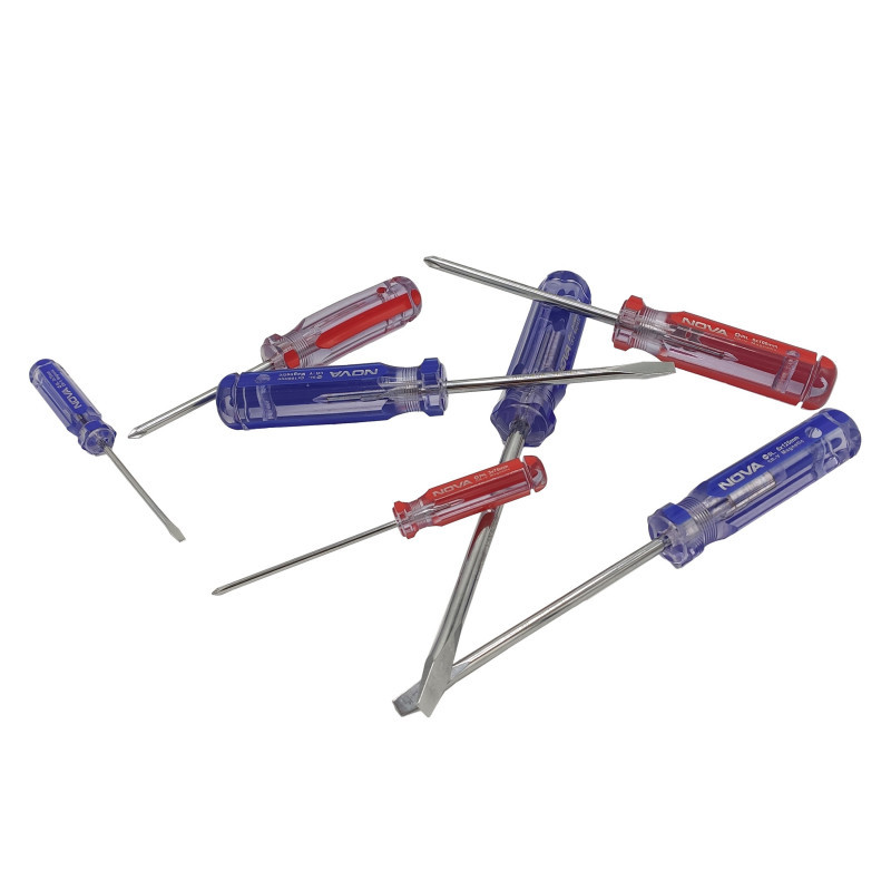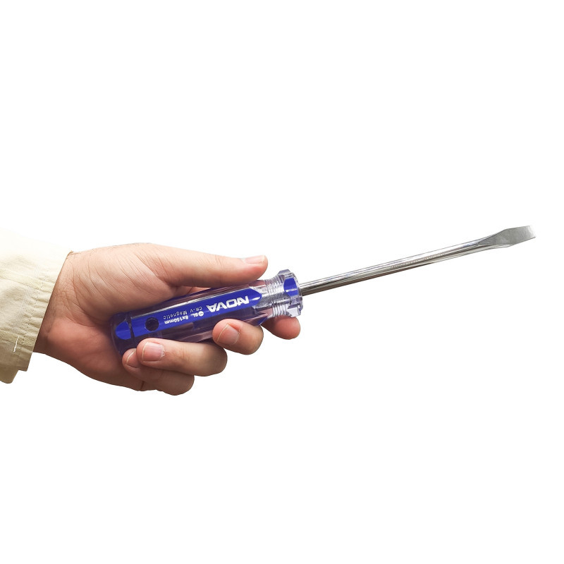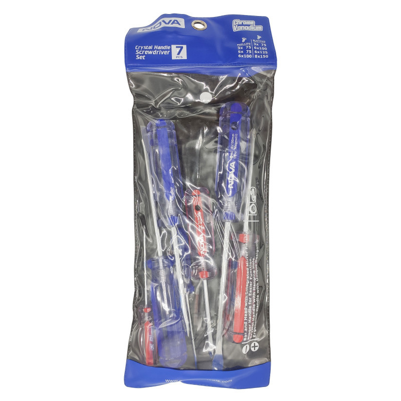 ست 7 عددی پیچ گوشتی نووا مدل NTS 1015، چهار عدد پیچ گوشتی دو سو و سه عدد پیچگوشتی چهار سو را در کیف پلاستیکی خود جای داده است. پیچگوشتیهای دوسو این مجموعه در ابعاد 150×8 و 125×6 و 100×6 و 75×3 میلیمتر طراحی و ساخته شده است و طراحی و ساخت پیچگوشتیهای چهار سوی این بسته نیز در سایزهای 100×6 و 75×5 و 75×3 میلیمتر انجام شده است.