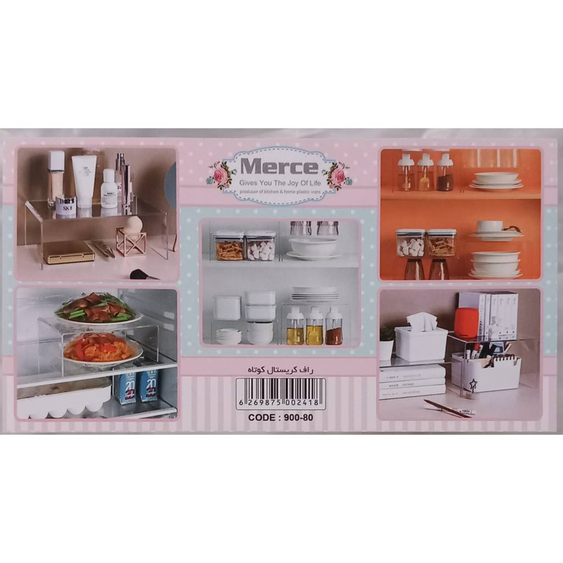 راف کریستال کوتاه مرسه، از جنس اکریلیک است. این محصول مناسب نظم دهی به طبقات کابینت، یخچال میز آرایش و … می باشد.