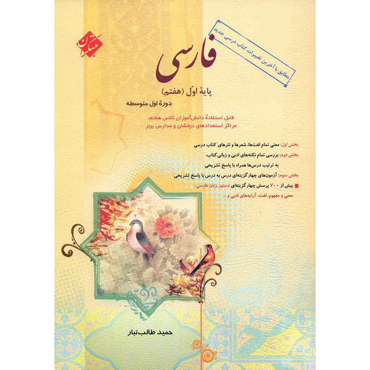 - پایهی هفتم درخشان و مدارس برتر - مطابق با آخرین تغییرات کتاب درسی جدید - شامل بیش از 700 پرسش چهارگزینهای دستور زبان فارسی، معنی و مفهوم، لغت، آرایههای ادبی و ... - دارای صفحات مصور