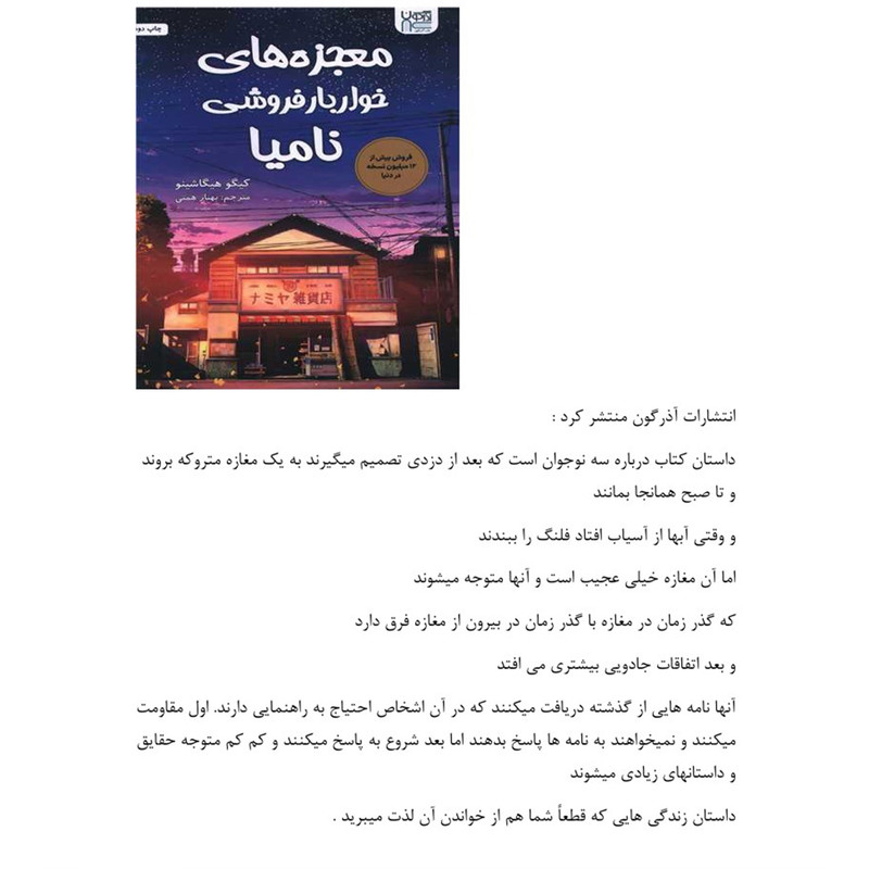 کتاب معجزه های خوار بار فروشی نامیا با بالاترین کیفیت چاپ و ترجمه توسط نشر آذرگون روانه ی بازار شده است.