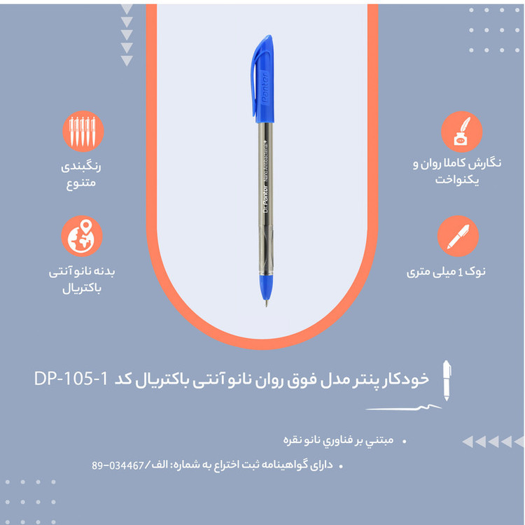 - خودکار فوق روان نانو آنتی باکتریال - سایز نوک 1 میلیمتری - نگارش کاملا روان و یکنواخت با جوهر Ultra Low Viscosity و نوک NS - دارای بدنه نانو آنتی باکتریال - مبتني بر فناوري نانو نقره - دارای گواهینامه ثبت اختراع به شماره: الف/89-034467