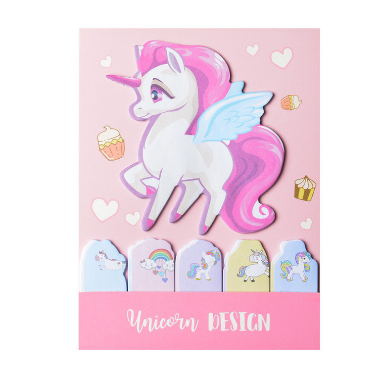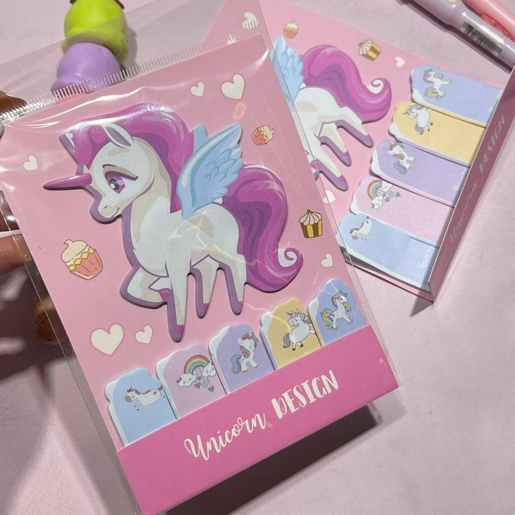 پنج ردیف کاغز پشت چسب دار با طرح یونیکورن و یک ردیف کاغذ پشت چسب دار با برش و طرح یونیکورن در یک بسته بندی . هر ردیف حدود 2 تا 25 برگ کاغذ دارد .