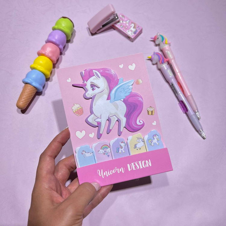 سایر توضیحات: پنج ردیف کاغز پشت چسب دار با طرح یونیکورن و یک ردیف کاغذ پشت چسب دار با برش و طرح یونیکورن در یک بسته بندی . هر ردیف حدود 2 تا 25 برگ کاغذ دارد .
