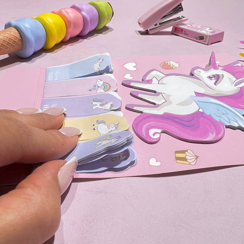 سایر توضیحات: پنج ردیف کاغز پشت چسب دار با طرح یونیکورن و یک ردیف کاغذ پشت چسب دار با برش و طرح یونیکورن در یک بسته بندی . هر ردیف حدود 2 تا 25 برگ کاغذ دارد .