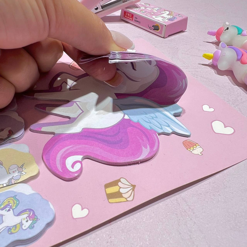 پنج ردیف کاغز پشت چسب دار با طرح یونیکورن و یک ردیف کاغذ پشت چسب دار با برش و طرح یونیکورن در یک بسته بندی . هر ردیف حدود 2 تا 25 برگ کاغذ دارد .