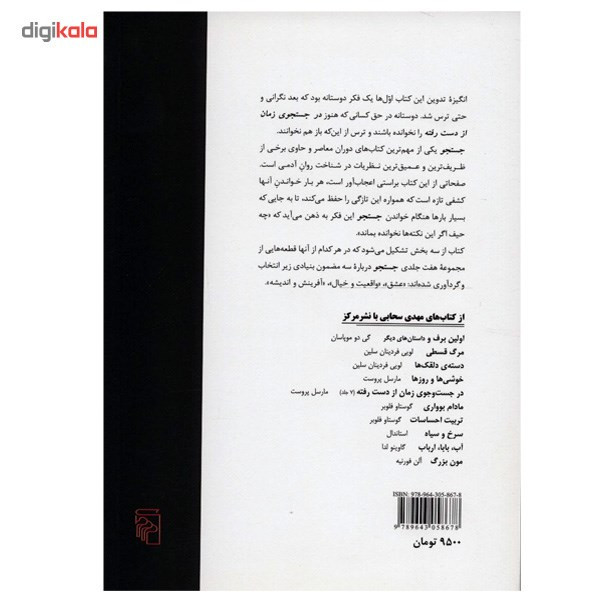 کتاب «گزیده هایی از در جستجوی زمان از دست رفته» نوشتهی «مارسل پروست» و ترجمهی «مهدی سحابی» است. در توضیحات پشت جلد کتاب آمده است: «انگیزه تدوین این کتاب اولها یک فکر دوستانه بود که بعد نگرانی و حتی ترس شد. دوستانه در حق کسانی که هنوز در جستجوی زمان از دست رفته را نخوانده باشند و ترس از این که باز هم نخوانند. "جستجو" یکی از مهمترین کتابهای دوران معاصر و حاوی برخی از ظریفترین و عمیقترین نظریات در شناخت روان آدمی است. صفحاتی از این کتاب براستی اعجابآور است، هر بار خواندن آنها کشفی تازه است که همواره این تازگی را حفظ میکند، تا به جایی که بسیار بارها هنگام خواندن جستجو این فکر به ذهن میآید که "چه حیف اگر این نکتهها نخوانده بماند". کتاب از سه بخش تشکیل میشود که در هر کدام از آنها قطعههایی از مجموعه هفت جلدی جستجو درباره سه مضمون بنیادی زیر انتخاب و گردآوری شدهاند: "عشق"، "واقعیت و خیال"، "آفرینش و اندیشه".» در قسمتی از کتاب میخوانیم: «تجربه باید به من میآموخت – البته اگر هیچگاه چیزی به کسی آموخته باشد – که عاشقی یک نفرین است. مانند نفرینهایی که در قصهها میخوانیم و علیهاش کاری نمیشود کرد و فقط باید صبر کنی تا افسونش پایان بگیرد.» این کتاب را نشر «مرکز» منتشر کرده است.