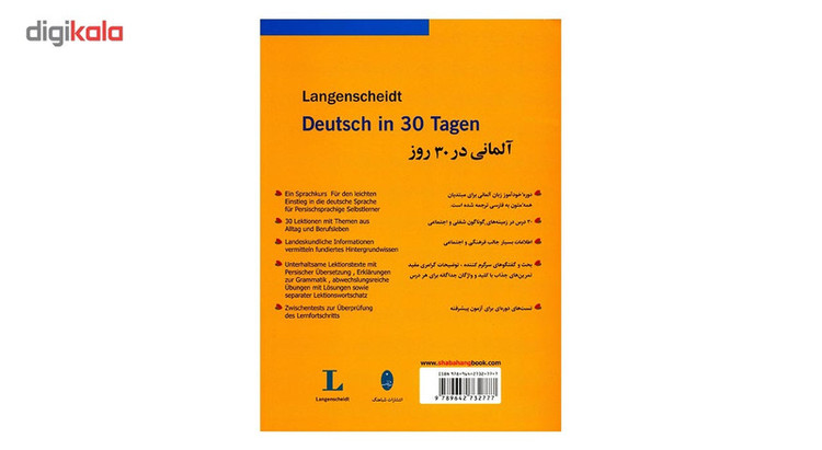 کتاب «آلمانی در 30 روز» خودآموز سریع و موثر برای آموزش مبانی زبان آلمانی نوشتهی «آنگلیکا گ. بک» با ترجمهی «محمد تقیزاده» تدوین شده است. این کتاب 30 درس در زمینههای گوناگون شغلی و اجتماعی را دربردارد و شامل گفتگوهای روزمره، سفر و شغل، داستانهای ادامهدار و سرگرمکننده است و پس از هر درس نیز خودآزمایی ارائه شده است. برای تمرین بیشتر، آزمونهای میان دورهای و آزمون نهایی نیز برای مخاطبان در نظر گرفته شده است. در پایان این دورهی آموزشی میتوانید دربارهی موضوعات عمومی و موقعیتهای روزمره صحبت کنید و منظور خود را بیان کنید. این سطح معادل سطح A2 در چارچوب استانداردهای آموزشی زبان در اروپاست. کتاب حاضر را انتشارات «شباهنگ» منتشر کرده و در اختیار مخاطبان قرار داده است.