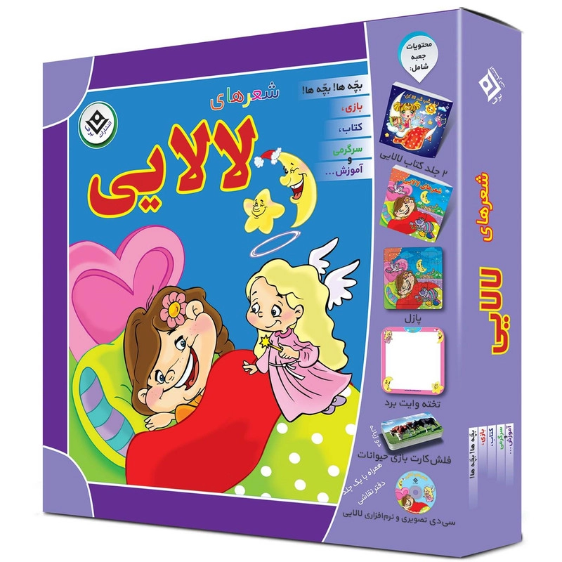 ۲ جلد کتاب شعر لالایی کودکانه ۱ جلد دفتر نقاشی ۱ عدد پازل ۱ عدد تخته وایتبرد ۳۶ عدد فلش کارت بازی حیوانات ۱ عدد لوح فشرده (قابل اجرا در رایانه و دستگاه های صوتی و تصویری)