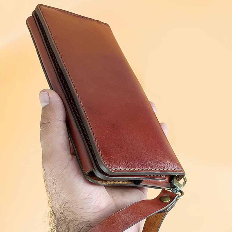کیف پول چرم آنا از چرم طبیعی با متریال عالی تهیه شده است کیف کاملا دست دوز و با دوخت دوسوزنه (از نظر استحکام و کیفیت بهترین نوع دوخت) دوخته شده است و در نهایت لبه های کار با دقت رنگ و پرداخت شده تا عمر و دوام چرم بیشتر شود. پهنای این کیف 11 سانت که یک سانت بیشتر از مدل های معمول طراحی شده تا به راحتی وسایل داخل آن قرار بگیرد و بعد از پر شدن محفظه های کیف باعث دفرمه شدن آن نشود کیف دارای 4 محفظه جدا، 10 جای کارت، 2 جای سیم کارت و 2 جای رم است.