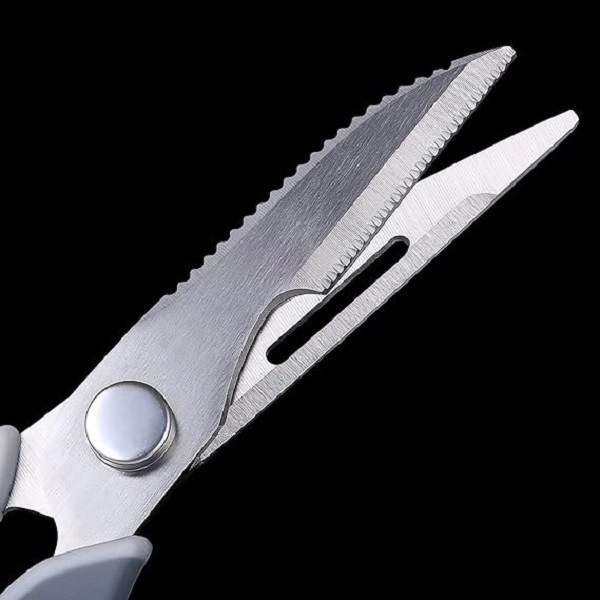 قیچی 8 کاره آشپزخانه یک قیچی منحصر به فرد است که با طراحی فوق العاده هوشمندانه ای که دارد می تواند چندین کار سنگین را با هم انجام دهد. در نگاه اول این محصول یک قیچی با تیغه های بسیار تیز به ضحامت 3 میلی متر از جنس استیل ضد زنگ با با دسته های بسیار خوش دست میباشد که میتوان از آن برای برش نان, میوه و سبزیجات و حتی مرغ و گوشت استفاده کرد اما پس از جدا کردن 2 تیغه ی این محصول از یکدیگر از کارایی بسیار بالای آن شگفت زده خواهید شد.اولین کاربرد هریک از تیغه ها استفاده به عنوان چاقویی بسیار تیز و کاربردی میباشد. در انتهای یکی از دسته های این قیچی قطعه ای فلزی قرار داده شده که میتوان از آن به عنوان درب باز کن , پیچ گوشتی 2 سو , لگه گیر سیب زمینی و حتی برای ایجاد سوراخ بر روی پوسته ی آهکی تخم مرغ استفاده کرد. از دیگر کاربردهای این قیچی میتوان به وجود پوست کن تیز بر روی یکی از تیغه ها اشاره کرد. ازویژگی های بسیار کاربردی این محصول تبدیل شدن یکی از تیغه ها به فلس گیر ماهی است که با چندحرکت به راحتی میتوان این کار را انجام داد.اما مهم ترین ویژگی این محصول که سبب تمایز آن با کالاهای مشابه میگردد خاصیت مگنتی این قیچی میباشد که به واسطه ی آن میتوانید قیچی را بر روی سطوح مختلف مانند یخچال نصب کرده و به این ترتیب قیچی بدون خطر برای فرزندانتان در دسترس شما باشد. همچین این محصول به راحتی شسته شده و قابلیت پلاسقرار دادن در ماشین ظرفشویی را نیز دارد.