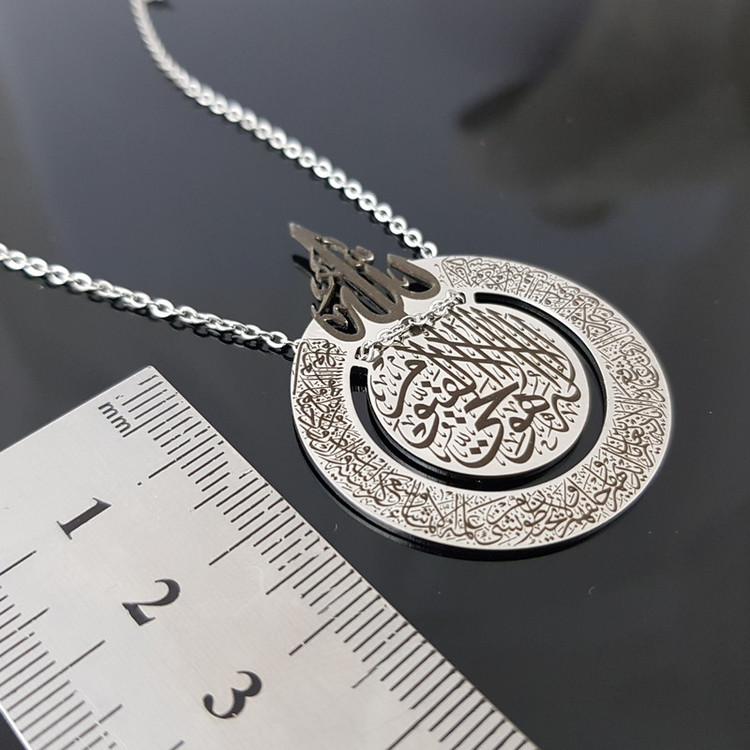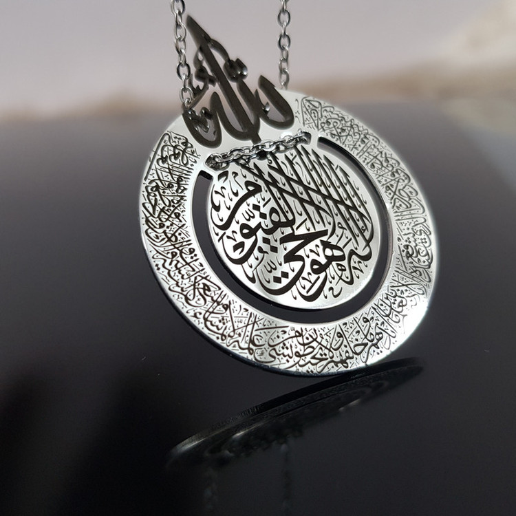 طرح پلاک گردنی تلفیقی از برش و حکاکی کاملا ثابت آیت الکرسی بوده و نقش الله بر بالای دایره برش و حکاکی شده و مابقی آیه بر رروی بدنه دایره ای شکل به صورت حکاکی در دوتکه وسط و کناری نقش بسته است .