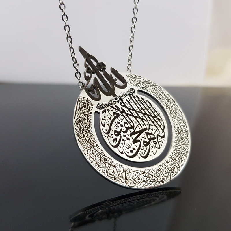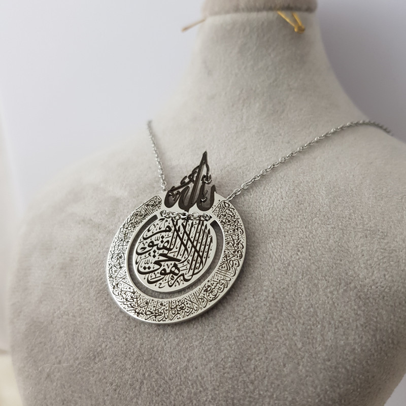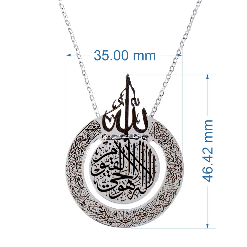 طرح پلاک گردنی تلفیقی از برش و حکاکی کاملا ثابت آیت الکرسی بوده و نقش الله بر بالای دایره برش و حکاکی شده و مابقی آیه بر رروی بدنه دایره ای شکل به صورت حکاکی در دوتکه وسط و کناری نقش بسته است .