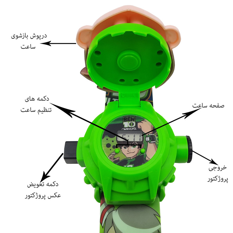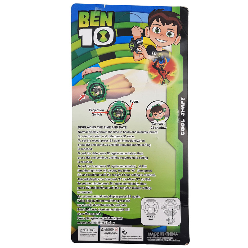 ساعت مچی دیجیتال بچه گانه مدل بن تن ، ساعت مچی زیبا و جذابی است که علاوه بر اینکه یک ساعت مچی فوق العاده برای بچه ها است، مجهز به یک پروژکتور زیبا برای نمایش 24 تصویر فوق العاده از کارتون بن تن نیز هست. بند نرم و زیبا، قابلیت تنظیم آسان ساعت، تنظیم تاریخ، کرنومتر و نمایش تصاویر زیبا به صورت پروژکتور از جمله امکانات این ساعت است. علاوه بر اینها رنگبندی عالی و طراحی زیبای تصاویری از کارتون بن تن همراه با کیفیت خوب مواد به کار رفته، این محصول را به هدیه ای درجه یک برای بچه ها تبدیل کرده است.