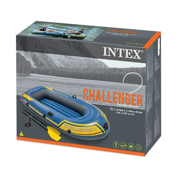 قایق بادی مدل چلنجر با کد 68367 با ظرفیت تحمل وزن 200 کیلوگرم برای استفاده دو بزرگسال مناسب است. ظاهر این قایق ترکیبی از رنگ آبی و نوار زرد رنگ است که هارمونی جذاب را به نمایش گذاشته است. این قایق به دلیل وزن سبک، به راحتی قایل حمل و جابه جایی است. این قایق شامل سه دریچه باد می باشد. یک دریچه متعلق به کف قایق و دو دریچه دیگر متعلق به بدنه قایق است. کف باد شونده قایق موجب می گردد هنگام نشستن در قایق احساس راحتی را تجربه کنید. همچنین کف قایق بادی چلنجر به صورت مواج طراحی شده تا از سر خوردن شما درون قایق جلوگیری شود. بدنه این استخر از دو لایه یا بخش داخلی و خارجی تشکیل شده است و بر روی هر دو لایه داخلی و خارجی دریچه باد تعبیه شده است. وجود این دو لایه مجزا برای باد زدن قایق موجب می شود به هنگام آسیب دیدگی یکی از این دو لایه ی بدنه، لایه ی دیگر بدنه، مانع از غرق شدن قایق گردد و موجب افزایش امنیت شما می شود. دو پارو از جنس پلاستیک فشرده با مقاومت و استحکام بالا درون بسته بندی این محصول موجود است که در دو طرف بدنه این قایق گیره هایی برای پارو تعبیه شده که پارو زدن را برای شما تسهیل می بخشد. دور تا دور این قایق طنابی به چشم میخورد که توسط گیره هایی که روی بدنه قایق تعبیه شده به قایق متصل شده است. از این طناب می توان به عنوان طناب نجات استفاده کرد. از دیگر کاربردهای این طناب این است که هنگامی که قایق را باد کرده اید می توانید از این طناب به عنوان دستگیره حمل استفاده نموده و به کمک آن قایق را جا به جا کنید. جنس قایق وینیل بوده و در مقابل نور آفتاب شدید، ساییدگی و پوسیدگی و ضربه بسیار مقاوم است.