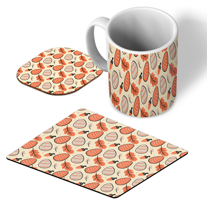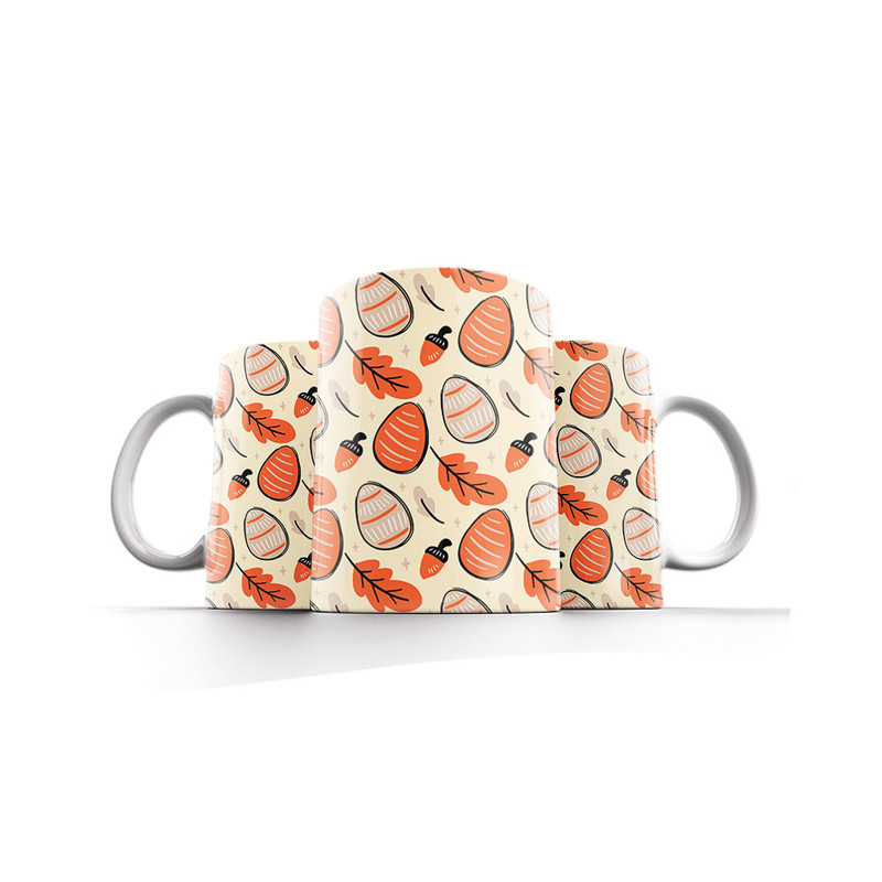 ماگ ترمه طراحان ایده مدل پترن برگ و تخم مرغ نارنجی کد strm0254 همراه با زیر لیوانی و موس پد