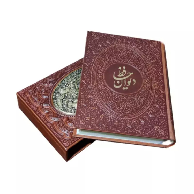 125275-کتاب نفیس دیوان حافظ وزیری گلاسه چرم قابدار کشویی برجسته طرح مس با فالنام