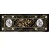 کتیبه طرح «چاپسنگی» از طرحهای چاپسنگی اصیل الهام گرفته شده است. طراحی این کتیبهها بهدست آقای سیداحمد باقریان و نگارگری آنها با هنر استاد اسدالله فقیهی انجام شده است. دو نگارگری در دوطرف کتیبه بهتصویر کشیده شده است: حضرت علیاکبر و حضرت عباس در سمت راست کتیبه، عبارت «این حسین کیست که عالم همه دیوانه اوست» و در سمت چپ عبارت «این چه شمعی است که جانها همه پروانه اوست» به خط استاد زینالعابدین اسماعیلی نوشته شده است. در میان کتیبه و بین دو نگارگری، عبارت «ان الحسین مصباح الهدی و سفینه النجات» بهخط استاد ناصر طاووسی نوشته شده است. بالای کتیبه، عبارت «من کان باذلاً فینا مهجته و موطناً علی لقاء الله نفسه، فلیرحل معنا» و در پایین کتیبه، ترجمه آن نوشته شده است: «هرکس میخواهد جان خود را در راه ما بذل کند و خود را برای ملاقات با خدا آماده کرده است، با ما کوچ کند». در چهار طرف کتیبه، چهار سلام «السلام علی الحسین و علی علی بن الحسین و علی الاولاد الحسین وعلی الاصحاب الحسین» و در میان آن، اسامی مقدس «یا سجاد، یا عباس، یا رقیه، یا زینب، یا امکلثوم، یا اباعبدالله، یا قاسم و یا رباب)» نقش بسته است. این اذکار بهخط استادانه استاد ناصر طاووسی نوشته شدهاند. تمام طرحها و نوشتههای این کتیبه به شیوه چاپ سابلیمیشن روی پارچه مخمل نقش گرفته است.