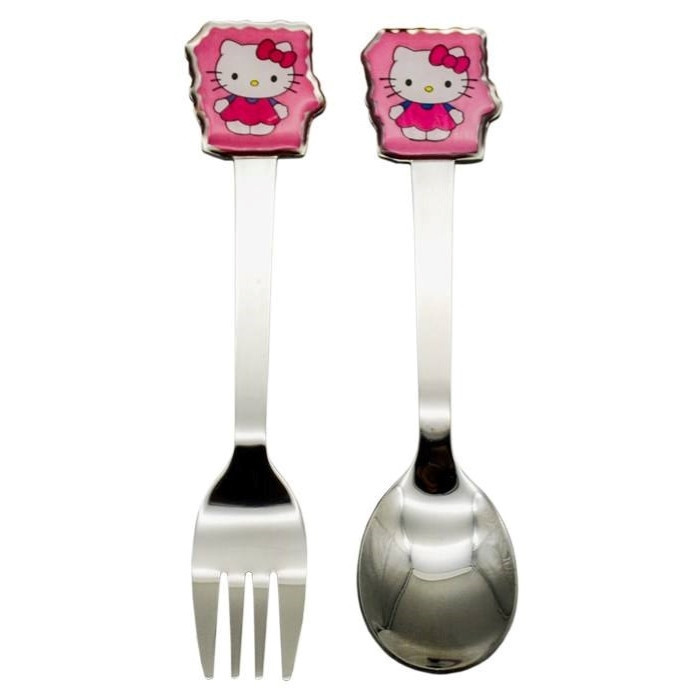قاشق و چنگال کودک طرح کیتی دارای یک عدد قاشق و یک عدد چنگال بسته بندی کوچک و زیبا ساخته شده از استنلس استیل مقاوم در مقابل حرارت و سرما
