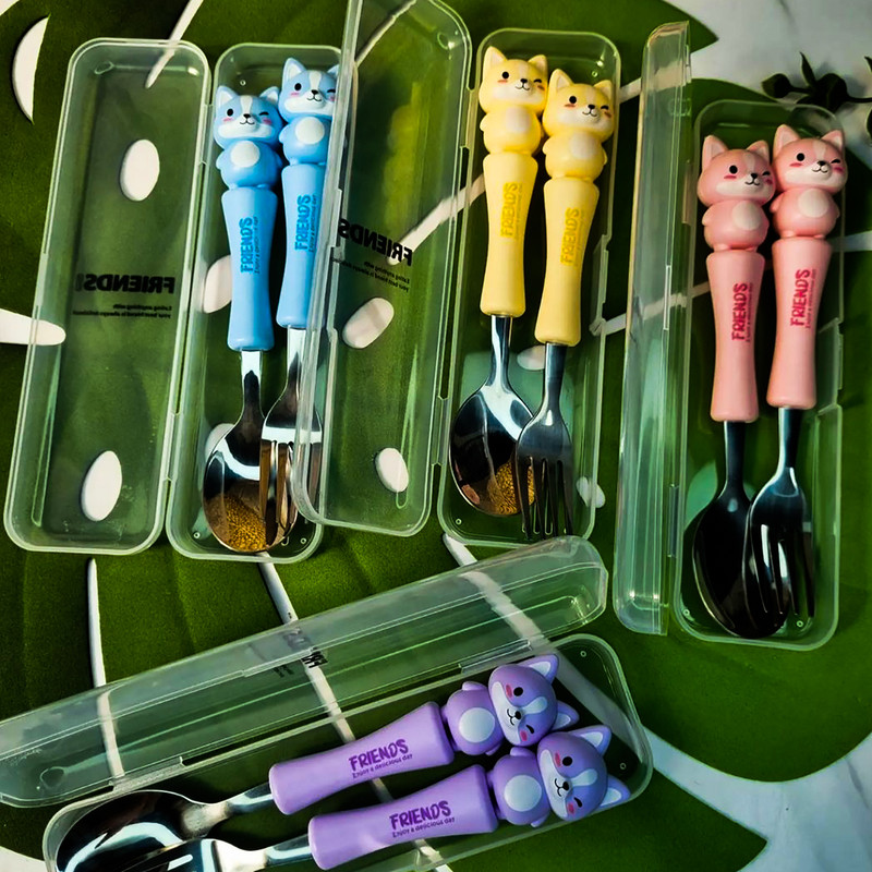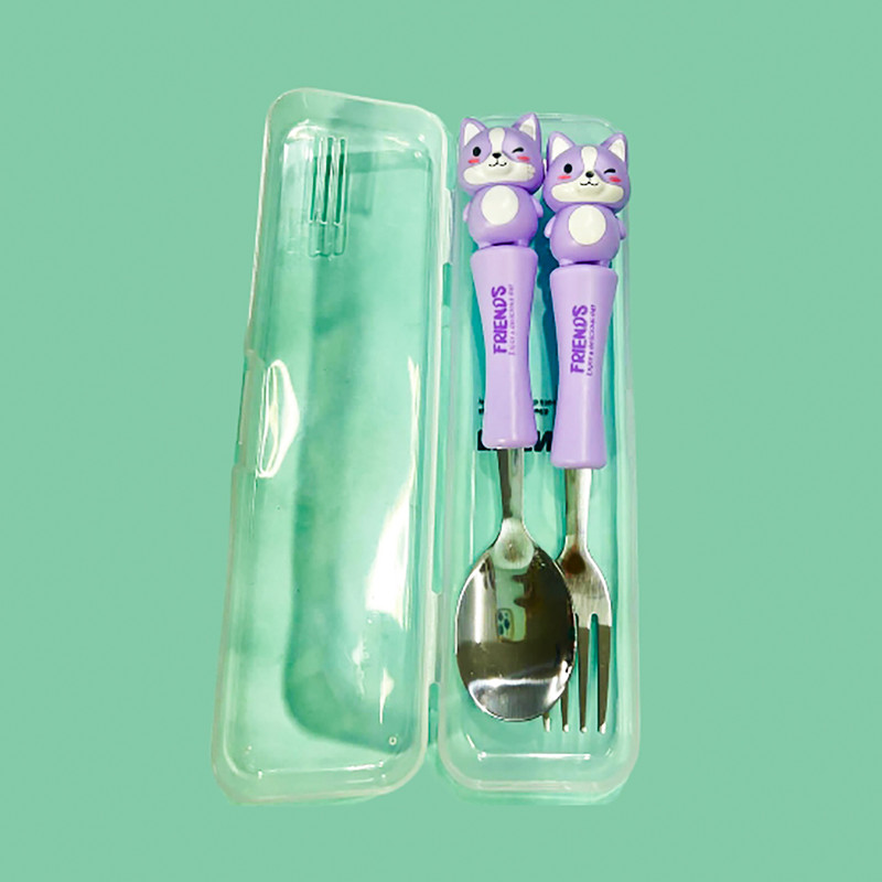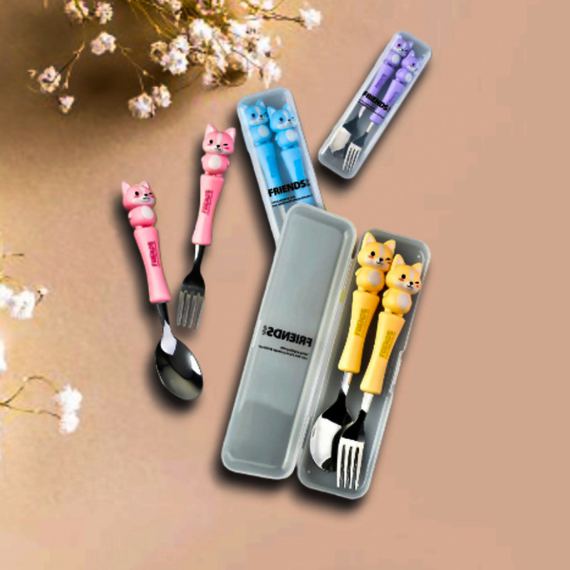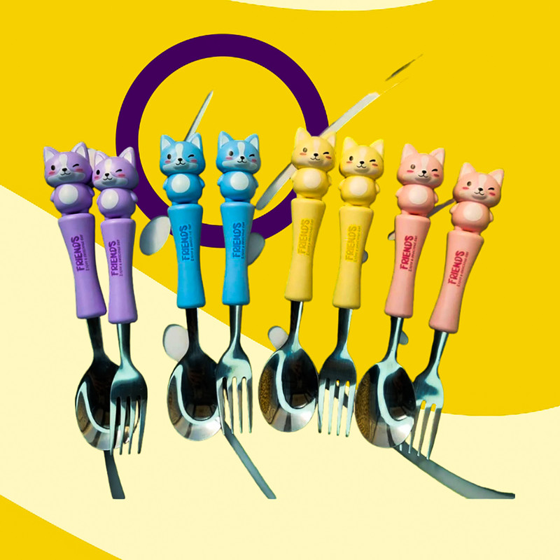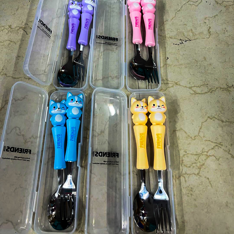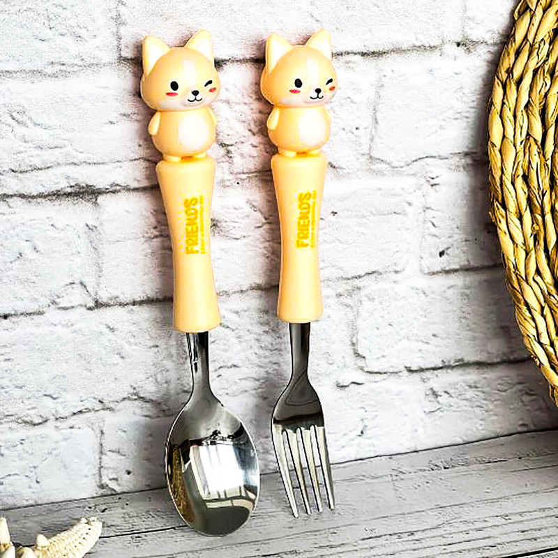 قاشق چنگال عروسکی کودک یک ست جدید که مختص کودکان ساخته شده و طول آن 17 سانتی متر است.که با توجه به طرح جذاب حیوانات آن که مورد علاقه ی بچه ها است غذا خوردن را برای آنها مانند یک تفریح لذتبخش می کند. دارای چهار رنگ آبی روشن_صورتی_بنفش روشن و زرد است. دسته ی آن از متریال با کیفیت پلاستیک سخت ساخته شده است که گزینه ای عالی برای کیف کودک و مادر محسوب می شود.این قاشق از استیل با کیفیت ساخته شده و دسته ی آن به خوبی متصل شده است.این محصول دارای بسته بندی زیبایی است از این رو گزینه ای عالی برای هدیه دادن است. ساخت کشور چین می باشد.
