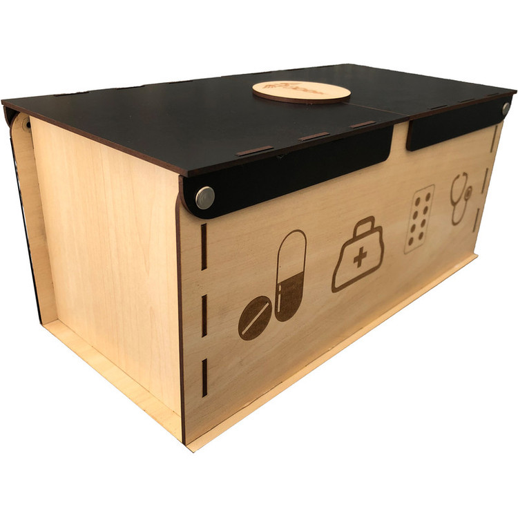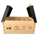 جعبه نگه دارنده دارو تهیه شده از چوب ام دی اف 3 میل دو رو رنگی با بهترین کیفیت است. در قسمت لولا این جعبه از پرچ فلزی کار شده است که علاوه بر استحکام بیشتر و زیبایی نسبت به لولای چوبی به شما این امکان را میدهد که درب را در هر زاویه ای نگه دارید. ابعاد کلی این جعبه 20 در 10 در ارتفاع 10 سانتیمتر است. این جعبه به شش قسمت تقسیم شده که ابعاد هر قسمت در عکس پنجم آلبوم جهت راحتی شما عزیزان نوشته شده است. ابعاد به گونه ای طراحی شده است که انواع قرص،آمپول،در آن قرار میگیرد. رنگ بدنه این جعبه کرم است و رنگ درب آن رنگی است که شما سفارش میدهید.