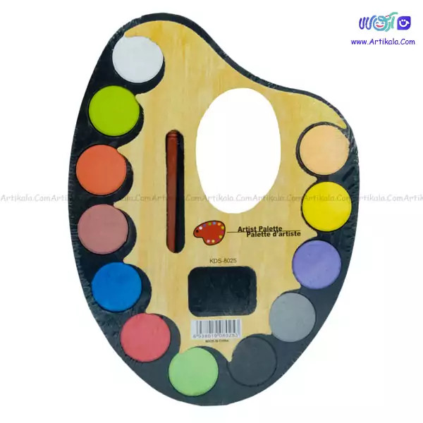 آبرنگ 12 رنگ پالتی کوچک دارا ی 12 رنگ مختلف همراه با یک عدد قلم مو می باشد که در قابی به شکل پالت قرار گرفته است .
