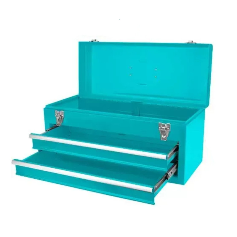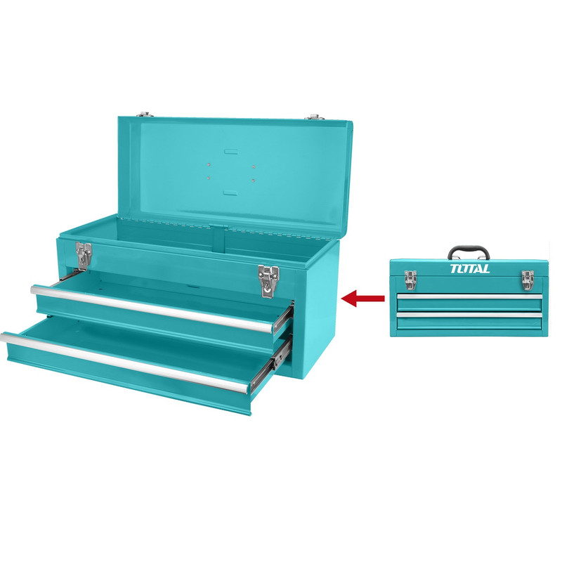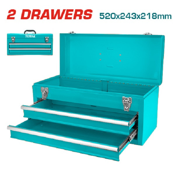 جعبه ابزار فلزی توتال مدل THPTC202یک جعبه ابزار زیبا و محکم است که توسط برند توتال در چین ساخته می شود ابعاد کلی این جعبه ابزار 520x218x243mm و از بدنه فلزی محکمی با ضخامت 0.8mm و کشوهایی با ضخامت 0.6mm بهره می برد این جعبه ابزار دو کشو با ابعاد 449x196x54mm دارد و ابعاد جعبه بالای آنها 510x210x60mm می باشد