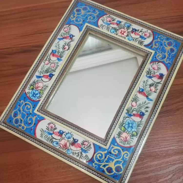 قسمت دور قاب آینه خاتم کاری شده و قسمت روی قاب، نقاشی زیبا با رنگ های لاجوردی و... و کار شده است