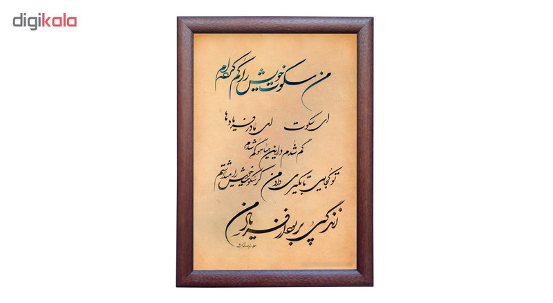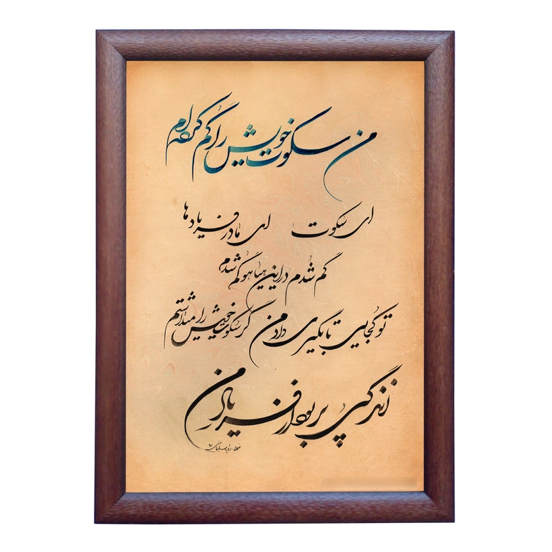 هنر خوشنویسی از برترین هنرهای ایرانیست و در بین خطوط زیبا و متنوع خوشنویسی، خط نستعلیق در مقام زیباترین آنها شناخته شده و به "عروس خطوط اسلامی" مشهور گشته است. این اثر خوشنویسی از آثار یکی از هنرمندان سرآمد و برجسته استان هنر پرور" اصفهان" سرکار خانم رویا سلیمانی می باشد. آثاری که نتیجه تجربه و دسترنج بیش از 15 سال تمرین وممارست ایشان است. تابلوهای خوشنویسی و خطاطی عرضه شده به دست این هنرمند ارجمند، همگی دستنویس بوده و در نهایت ظرافت و زیبایی و با قلم و مرکب و بر روی کاغذ گلاسه با پسزمینه سفید یا ابروباد آفریده شده اند. در نوشتن این آثار از آیات شریفه قرآن و ادبیات غنی و پربار فارسی بهره گرفته شده است. بدین نحو می توان این آثار را به عنوان هدیه ای ارزنده به هنردوستان و هنرمندان تقدیم نموده و با نصب آنها ، جلوه روح نوازی را به فضای اداری یا خانگی داد. شعر مرقوم شده در این تابلو که با خط زیبای شکسته نستعلیق نوشته شده است، از اشعار نغز و لطیف شاعر ارزنده و بزرگ معاصر زبان فارسی، "فریدون مشیری" می باشد.