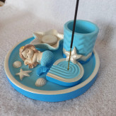 اکسسوری بتنی 5 تکه سنگ مصنوعی ست ساحلی ، اجزا شامل جاعودی ، جاشمعی ، مجسمه پری دریایی ، جای لوازم آرایشی و قلم و ماژیک