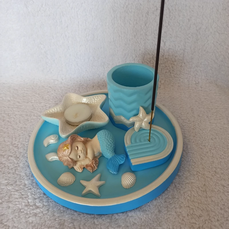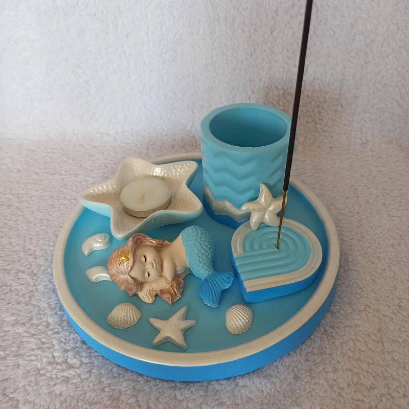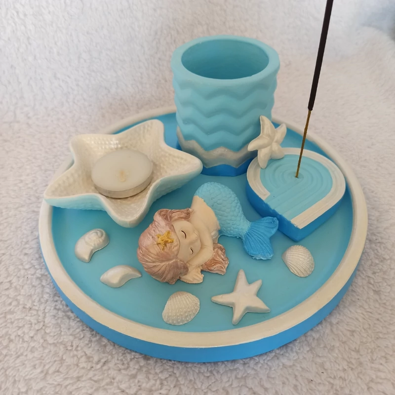 اکسسوری بتنی 5 تکه سنگ مصنوعی ست ساحلی ، اجزا شامل جاعودی ، جاشمعی ، مجسمه پری دریایی ، جای لوازم آرایشی و قلم و ماژیک