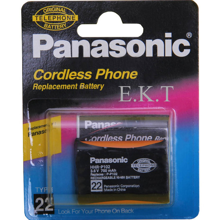 باتری تلفنهای بیسیم پاناسونیک مدل «HHR-P102E/1B» از نوع Ni-MH بوده و در ولتاژ 3.6 عمل میکنند. این باتری که در ابعاد 48 × 31× 11 میلیمتر طراحیشده است 39 گرم وزن دارد و در تلفنهای بیسیم پاناسونیک مدلهای 1220،TC1225،TC1245،TC1221،TC1230،TC1222،TC1232،TC1226،TC1227،C1238،TC1282،TC1231،TC1281 TC1271 استفاده میشود.