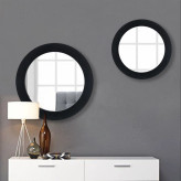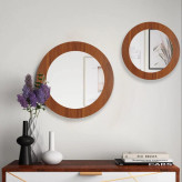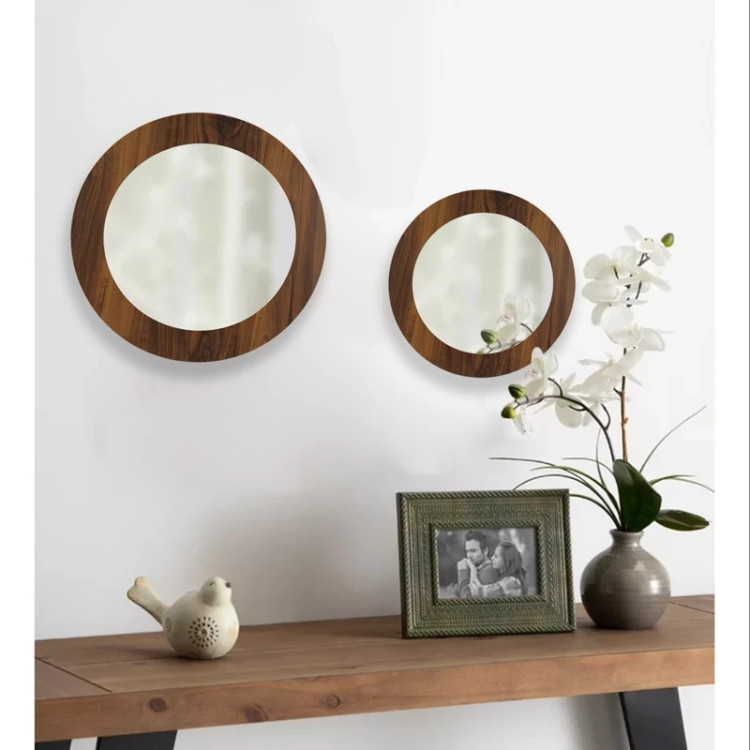 مجموعه 2 عددی گرد دلسا شامل 2 عدد آینه گرد چوبی (ابعاد آینه ها: 1- 25 سانتی متر، 2- 19 سانتی متر) که از طراحی و کیفیت منحصر به فردی برخوردار می باشد. این محصول تولید شده از ورق MDF وارداتی با روکش ملامینه (مقاوم در برابر رطوبت) می باشد که جلوه ی زیبایی را برای شما به ارمغان می آورد، پشت این محصول حفره ای به صورت مثلث طراحی شده که نصب آن را تنها به کمک یک میخ ریز آسان می کند. از این محصول می توانید برای دکوراسیون منزل یا محل کار، دیوارهای پشت مبل، کنسول، بالای جاکفشی و ... استفاده نمایید، درهنگام تحویل کالا به لوگوی ALEF در پشت هر آینه توجه فرمایید.