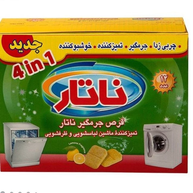 میکند و با پاک کردن رسوبهای المنت ماشین موجب دوام ماشین و بالا رفتن راندمان آن میشود. این قرص در بستهبندی 12 عددی عرضه میگردد و برای رسیدن به نتایج مطلوب توصیه میشود هرماه از قرص جرمگیر ناتار در ماشین ظرفشویی و لباسشویی استفاده شود. لطفا هنگام استفاده از جرمگیر ناتار به دستور مصرف روی بستهبندی توجه کنید و ماشین را بدون ظرف یا لباس روشن کنید.قرص جرمگیر ناتار محصولـی پرقدرت اسـت و با نفوذ به کلیه قسمتهای ماشین ظرفشویی و لباسشویی آنها را تمیز و از آلودگیها پـاک مینماید و موجب افزایش کارایی و طول عمر ماشیـن میشود.