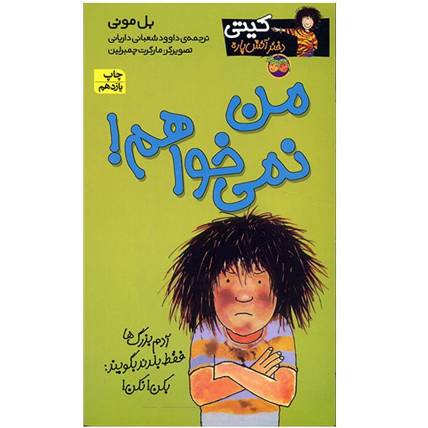 کتاب «من نمیخوام!» نوشتهی «بل مونی» با تصویرگری «مارگرت چمبرلین» را «داوود شعبانی داریانی» به فارسی برگردانده است. این کتاب اولین جلد از مجموعهی «کیتی دختر آتشپاره» است که برای کودکان گروه سنی (ج) تدوین شده است. «حوصله ام سر رفته!»، «من نمیتوانم پیدایش کنم!»، «منصفانه نیست!»، «اما تو قول داده بودی!»، «آخه چرا نه؟»، «من از خیلی چیزها سر در میآورم!»، «من میترسم!»، «ای کاش!»، «ولی چرا من؟»، «تقصیر من نیست!»، «خب که چی؟»، «دوستان من» و «فکرهای بکر کیتی» عنوان کتابهای دیگر این مجموعه است. در توضیح پشت جلد کتاب آمده است: «نه حالا خیلی زود است، نمیخواهم بخوابم! حالش را ندارم مسواک بزنم! اتاقم را مرتب نمیکنم. نمیخواهم، نه! "نه" کلمهی محبوب کیتی است. اما نه گفتن خیلی هم کار راحتی نیست و بعضی وقتها دردسرهای بیشتری درست میکند. شاید تو هم مثل کیتی هستی که گاهی با خودش یا بزرگترها مشکل پیدا میکند. با این همه دلش میخواهد کارش درست باشد و اوضاع را بیریخت نکند. اگر دوست داری با او و زندگیاش آشنا بشوی مجموعه 14 جلدی «کیتی دختر آتش پاره» را بخوان.» کتاب حاضر را نشر «افق» منتشر کرده است.