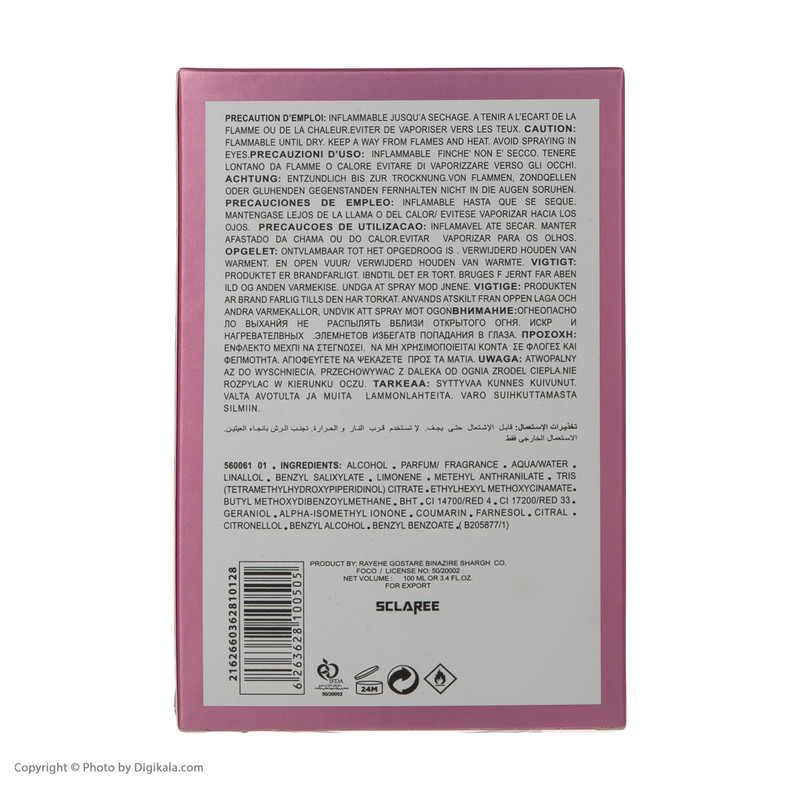 نت آغازینتمشک , ترنج , فلفل صورتی , دانههای قرمزساختار نتهامیوه , گیاهان معطر , گلنت پایانیزنبق , چوب صندل سفید , مشک , نعناع هندینت میانیرز , گل برف , گل صدتومانیساختار رایحهشرقی , گل , گرم , شیرینصادر کننده مجوزسازمان غذا و داروحجم100 میلیلیتر