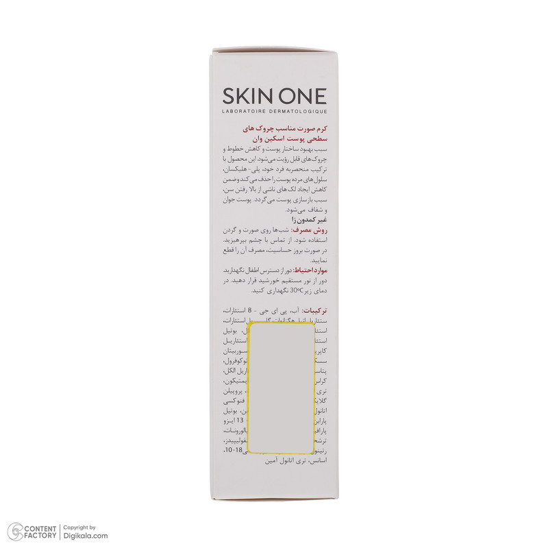 کرم ضد چروک صورت اکتیو رتینول 0.5 اسکین وارن، سفت کننده و بازسازی کننده پوست بوده و باعث لايهبرداری و شفافيت پوست شما میشود. کرم ضد چروک اکتیو رتینول SKIN ONE، مناسب کاهش چروکهای سطحی و قابل رویت پوست است. این کرم بواسطه ترکیبات منحصر به فرد خود، سبب بهبود ساختار پوست و حذف سلولهای مرده میگردد. همچنین این محصول با بازسازی پوست، سبب کاهش ایجاد لکهای ناشی از بالا رفتن سن شده و پوستی جوان و شفاف را به ارمغان میآورد. رتینول یکی از ترکیبات این محصول است که از مشتقات ویتامین A بوده و یکی از موثرترین ترکیبات در رفع چروکها، افزایش میزان کلاژن و بازسازی طبیعی سلولی در اپیدرم است. همچنین با اثر لایهبرداری سبب کاهش لکها میشود. از طرفی ترمیم کننده و محافظ کننده پوست در برابر آسیبهای متعدد نیز است. لازم به ذکر است کرم ضد چروک Active Retinol 0.5 اسکین وان، غیرکمدونزا و مناسب انواع پوست میباشد. کرم ضد چروک اسکین وان ساخت ایران است و دارای فرمولاسیون فرانسوی میباشد.
