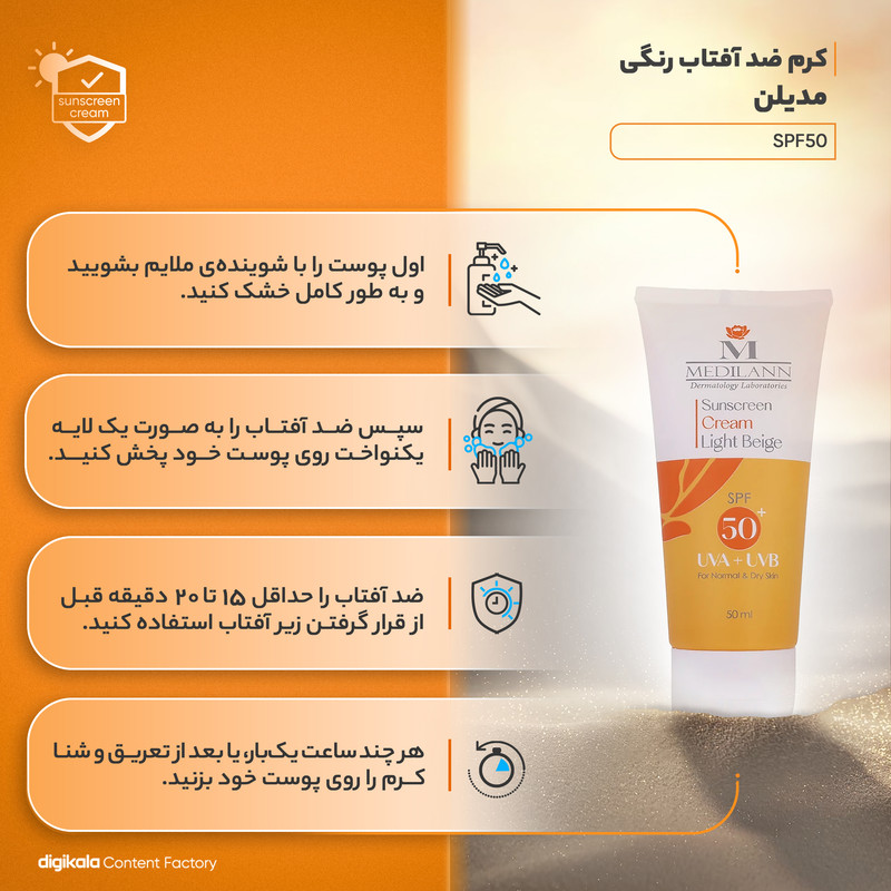 هر روز در معرض نور خورشید هستیم اما همیشه به اثرات منفی آن بر روی پوست توجه نمیکنیم، گرمای خورشید لذت بخش است اما اگر از پوست در برابر نورِ آن حفاظت نشود باعث چین و چروک، لک و حتی در موارد حاد سرطان میشود. البته این به معنی دوری همیشگی از نور خورشید نیست اما باید با حفاظت کامل در برابر آن قرار گرفت. ضد آفتابها یکی از بهترین و کاملترین حافظت کنندهها هستند که با قدرت SPFهای مختلف و متناسب با جنس و رنگ پوست میتوانند انتخاب شوند. میزان SPF برای افراد با پوست روشن باید بالا و برای افراد با پوست متوسط و تیره کمتر از آن باشد. کرم ضد آفتاب رنگی با SPF 50 مدیلن یکی از گزینههای مناسب برای افرادی با پوست خشک و معمولی است که علاوه بر حفاظت کامل پوست در برابر اشعه ماوراء بنفش، پوست را مرطوب کرده و در برابر آب و تعریق مقاوم است. این محصول دارای Parsol که یک ضد آفتاب شیمیایی با خاصیت جذب آفتاب و جلوگیری از آسیب اشعه آن است، میباشد. این ضد آفتاب 50 میلی لیتری از پیری زودرس پوست جلوگیری کرده ومی تواند نقش کرم پودر را نیز ایفا کند.