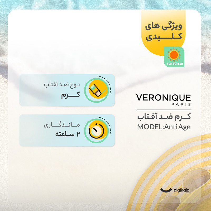 کرم ضد آفتاب و ضد چروک VERONIQUE دارای SPF50 میباشد و با ترکیبات موثر و طبیعی سبب محافظت بسیار قوی در برابر اشعههای ماوراء بنفش و مادون قرمز شده و همچنین به کاهش لکها کمک میکند. ضد آفتاب ورونیک نه تنها از پوست در برابر اثرات آسیب رسان آفتاب به واسطه جدیدترین و قوی ترین فیلترهای ضد آفتاب TINOSORB M,S محافظت می نماید، بلکه با بهره گیری از عوامل موثر ضد چروک، آنتی اکسیدان، روشن کننده و رطوبت رسان، تاثیر چشمگیری در کاهش علائم پیری زودرس پوست دارد.