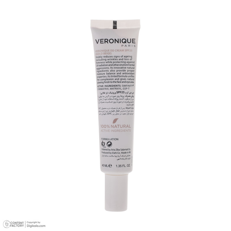دی دی کرم VERONIQUE SPF25 یک محصول چند منظوره و کاربردی است و به طور هم زمان چهار مراقبت برای پوست شما را به ارمغان می آورد: محافظت در برابر پرتوهای فرابنفش، خنثی کردن اثر رادیکالهای آزاد، برطرف کردن علائم پیری پوست همچون چین و چروک و شل شدگی و آبرسانی به پوست. دی دی کرم رنگ بژطلایی ورونیک پایه خوبی برای آرایش است و نقش پرایمر را ایفا میکند. دی دی کرم ورونیک یه کرم چند منظوره است که علاوه بر خاصیت پوشانندگی مثل یک کرم پودر سبک، ضد چروک نیز میباشد. کرم دی دی ورونیک آبرسانی خوبی را برای پوست شما به ارمغان می آورد و رنگ پوست را اصلاح و یکدست میکند. دی دی کرم بژ طلایی VERONIQUE در واقع یک پرایمر، کرم پودر، مرطوب کننده و ضد چروک است و خاصیت ضد آفتاب نیز دارد.