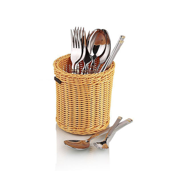 – ارگانایزر استوانهای – مناسب برای نگهداری و نظم دادن به قاشق و چنگال، لوازم تحریر، لوازم آرایش و… – جنس مواد پلاستیک با طرح برگرفته از سبدهای حصیر بافت – دارای بافت حصیریشکل