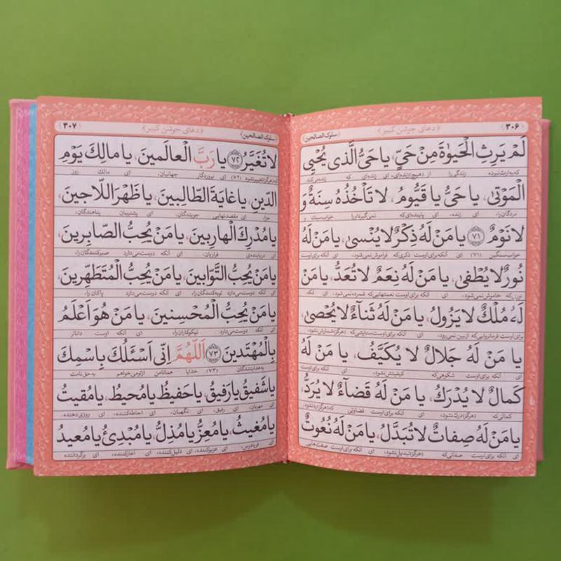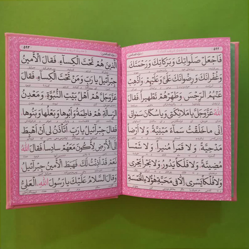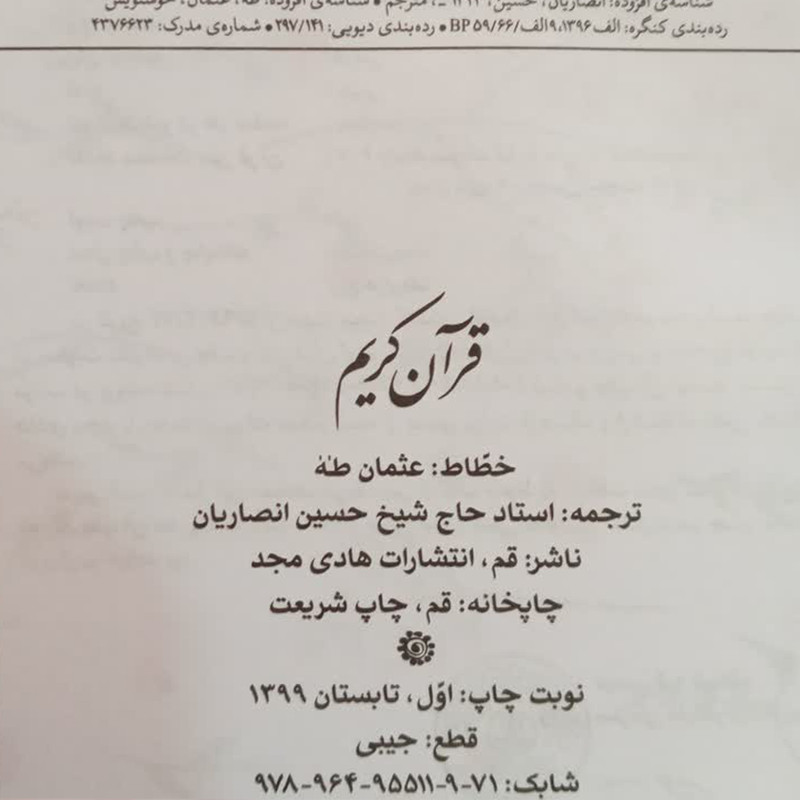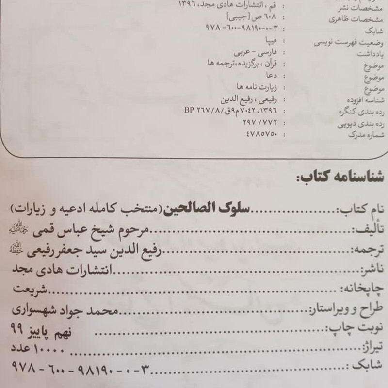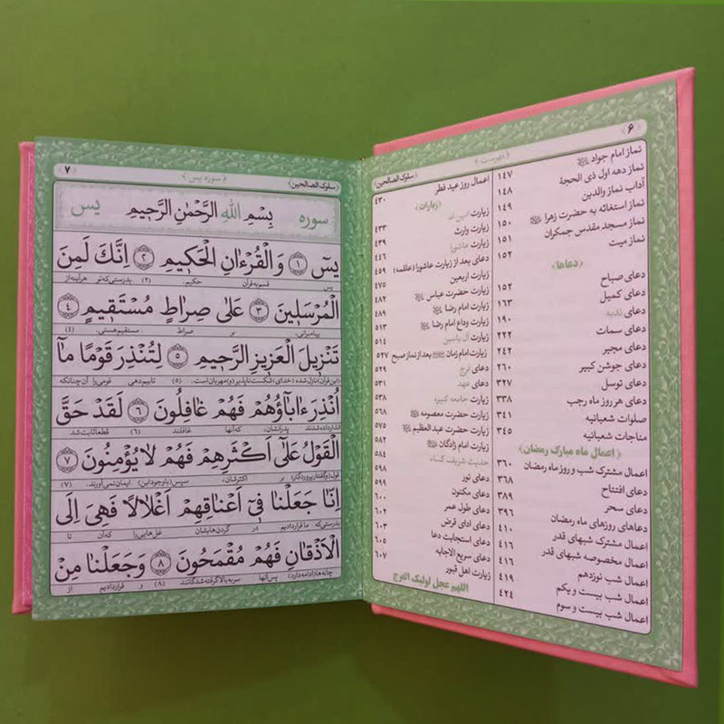 این کتاب مجموعه 2 جلدی قرآن و منتخب مفاتیح در قطع جیبی ( اندازه 19 در12 سانتیمتر) و جلدرنگی قابدار داخل رنگی است که قرآن آن به رسم الخط عثمان طه و ترجمه حسین انصاریان با611 صفحه میباشد. منتخب مفاتیح آن ترجمه رفیع الدین سید جعفر رفیعی است با 608 صفحه و درشت خط که توسط انتشارات هادی مجد به چاپ رسیده است .