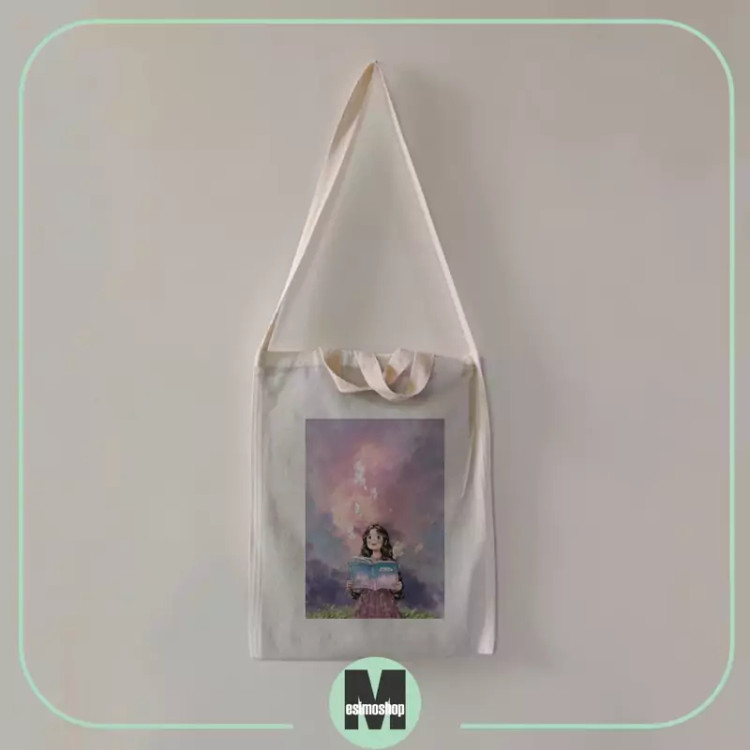 ساک دستی دوشی پارچه ای طرح دختر و کتاب ، توت بگ چاپ شده ، جنس متقال ، سایز 42 در 36 سانت
