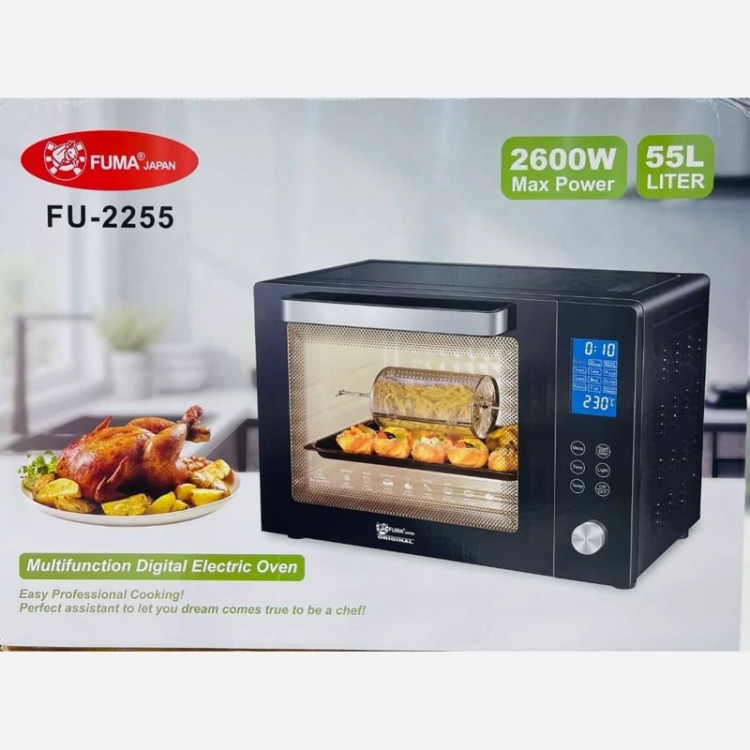 آون توستر فوما سایز 55 لیتر با قدرت 2600 وات با صفحه کنترل دیجیتال تمام تاچ با برنامه های پخت اتوماتیک دارای شیشه 2 جداره دارای جوجه گردان و فن و چراغ