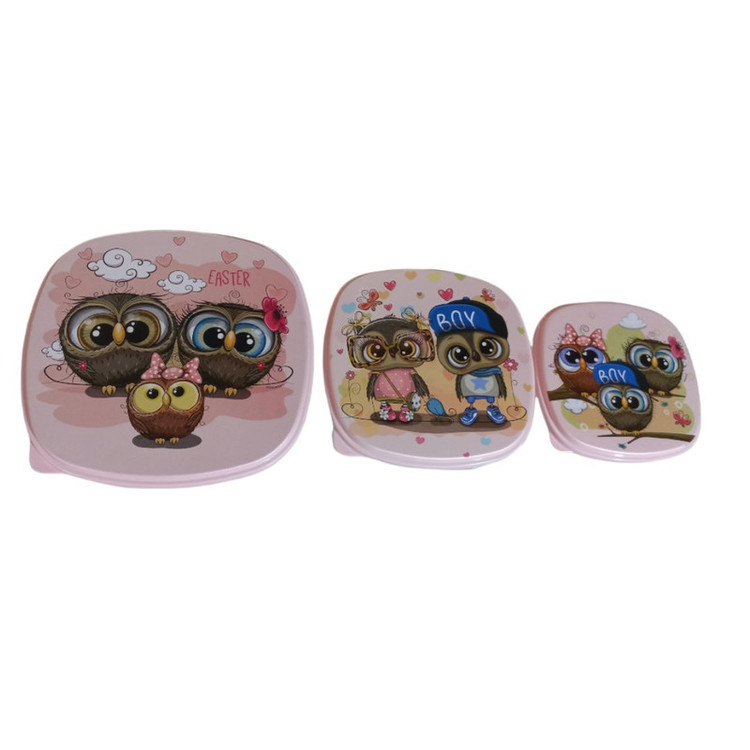 این ظروف نگهدارنده شامل 3 قطعه می باشد. ابعاد ظرف بزرگ 11x22x22 سانتی متر است. ابعاد ظرف متوسط 10x19x19 سانتی متر است. رنگ درب های آن صورتی و رنگ بدنه بی رنگ می باشد. ابعاد ظرف کوچک 9x15x15 سانتی متر می باشد.