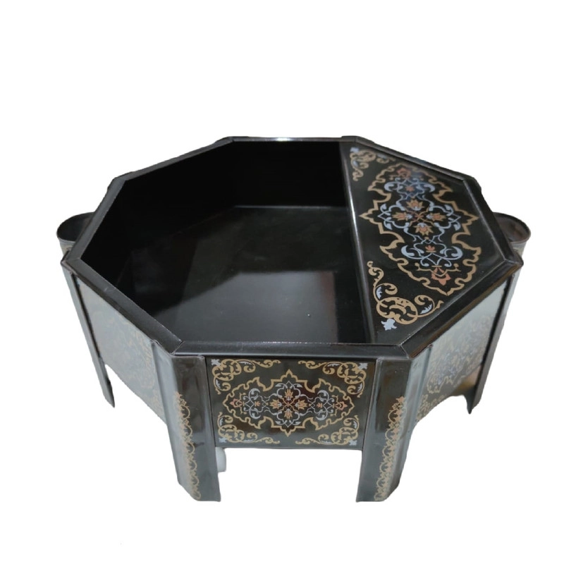 منقل هشت گوش جا قوری دار جنس منقل ورق فولادی با ضخامت 6 میلیمتر با دو دسته کنار برای بلند کردن منقل با طراحی منحصر به فرد که با داغ شدن منقل رنگ و طراحی تغییر نمیکند