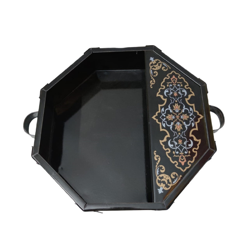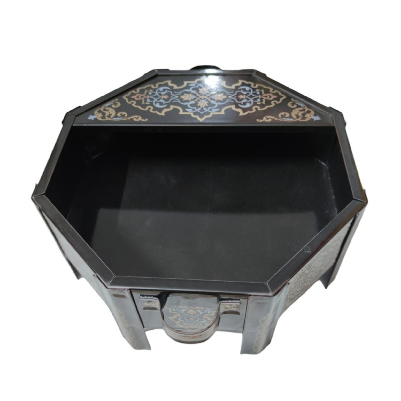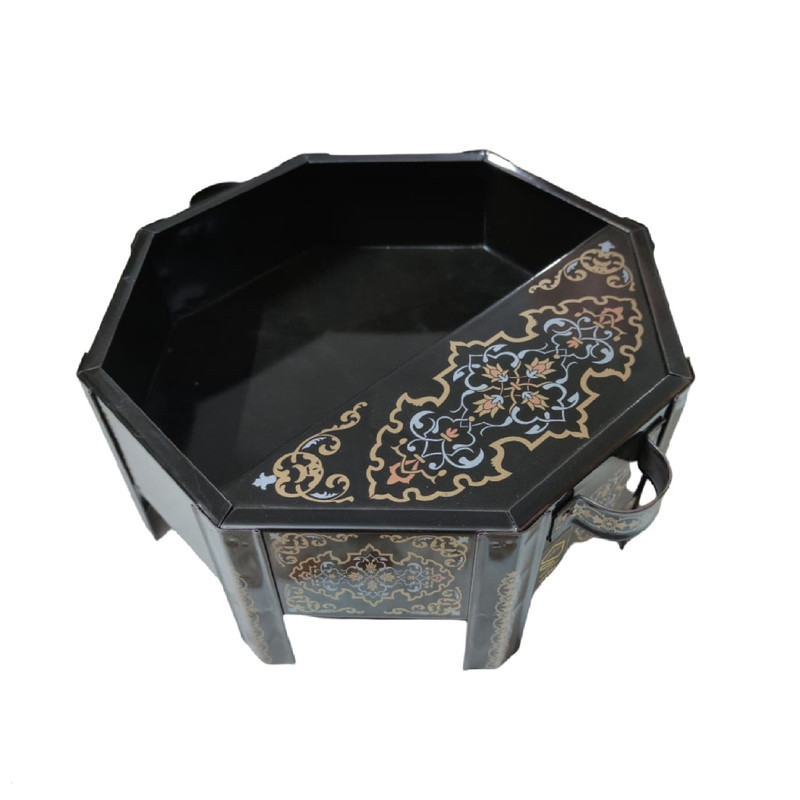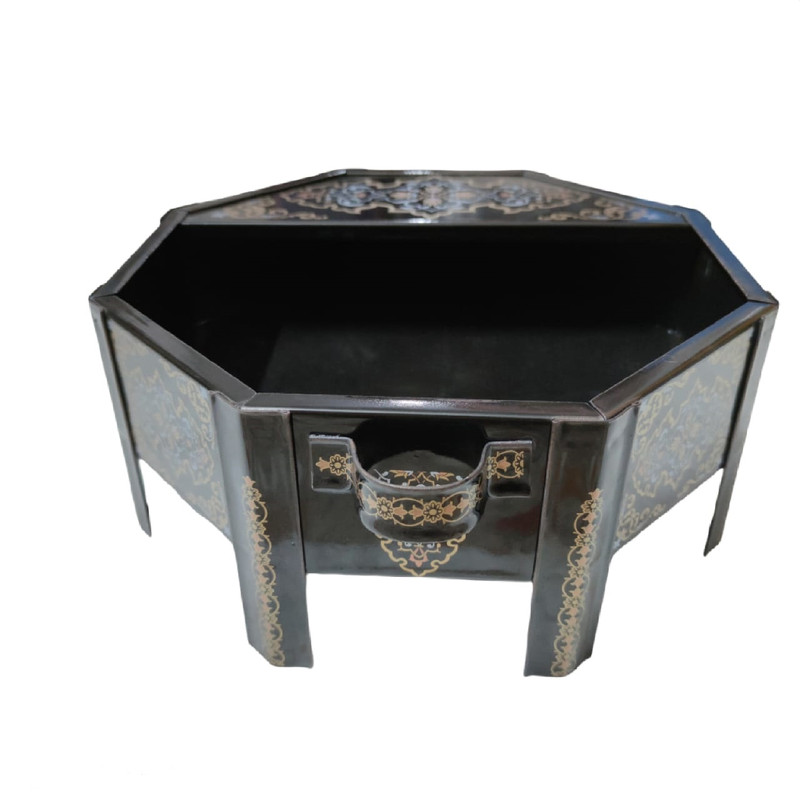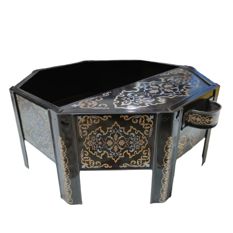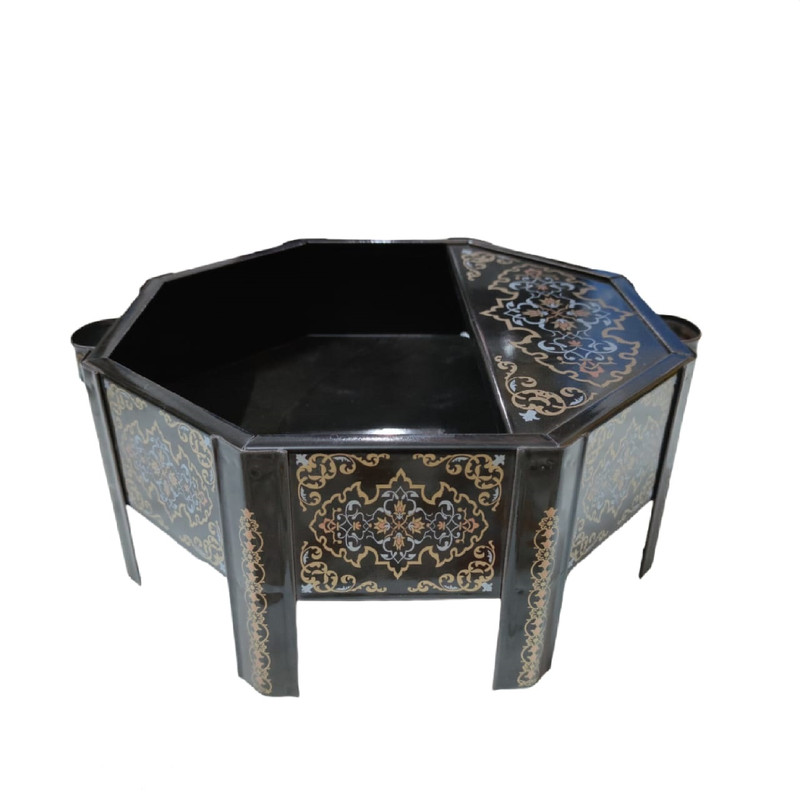 منقل هشت گوش جا قوری دار جنس منقل ورق فولادی با ضخامت 6 میلیمتر با دو دسته کنار برای بلند کردن منقل با طراحی منحصر به فرد که با داغ شدن منقل رنگ و طراحی تغییر نمیکند