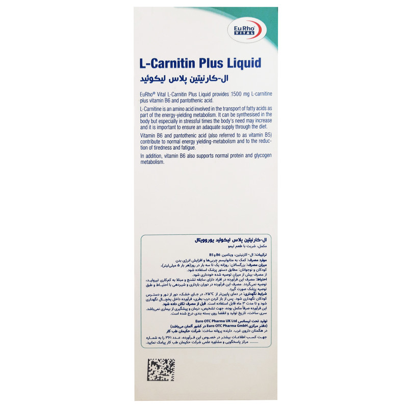 شربت ال کارنیتین پلاس یوروویتال تامین کننده 1500 میلی گرم ال کارنیتین به علاوه ویتامین B6 و پانتوتنیک اسید است. ال کارنیتین یک نوع اسید آمینه بوده که در انتقال اسیدهای چرب به عنوان بخشی از متابولیسم انرژی نقش دارد. این ماده میتواند در بدن سنتز شود، خصوصا در مواقع استرس، نیاز بدن به این ماده افزایش مییابد و تامین میزان کافی از این ماده از طریق رژیم غذایی لازم و ضروری به نظر میرسد. ویتامین ب 6 و پانتوتنیک اسید موجود در این شربت در متابولیسم طبیعی انرژی و کاهش ضعف و خستگی موثر است. علاوه بر این، ویتامین ب 6 در متابولیسم طبیعی گلیکوژن و پروتئین نیز نقش دارد.