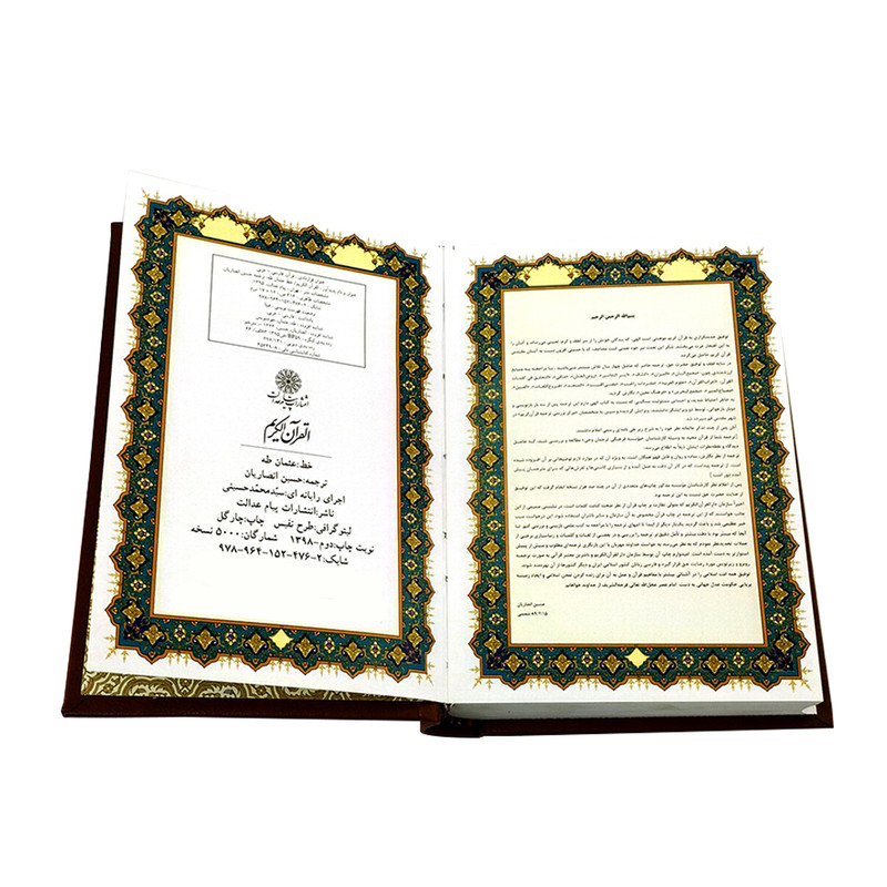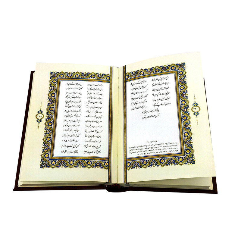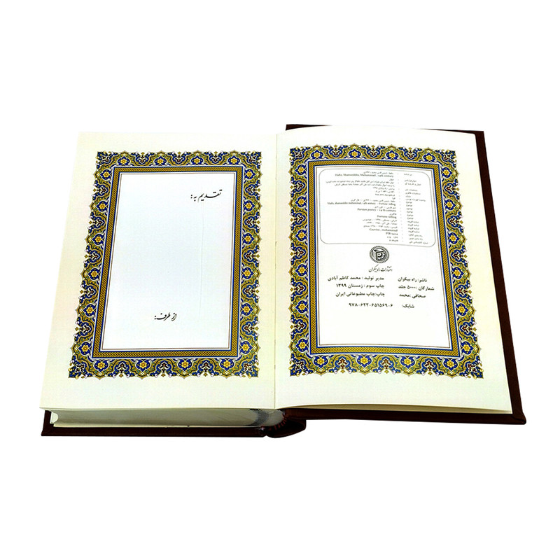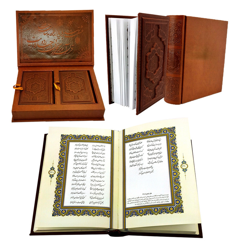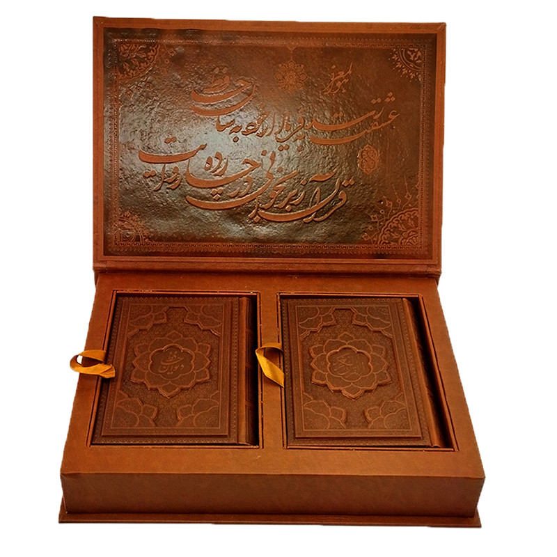 این محصول زیبا و نفیس 2جلدی قرآن و حافظ از نوع جیبی می باشد , که نوع جلد آن چرم مصنوعی برجسته جعبه دار طرح مس با طراحی بسیار زیبایست , نوع کاغذ این کتاب گلاسه با کیفیت خوبی است .