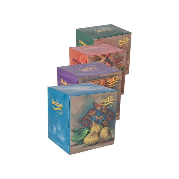 این پک شامل چهار بسته دستمال 75 برگه دو لایه ( 600 برگ یک لایه) می باشد. کیفیت درجه یک طرح ساده 100 درصد تیشو(با الیاف خارجی)